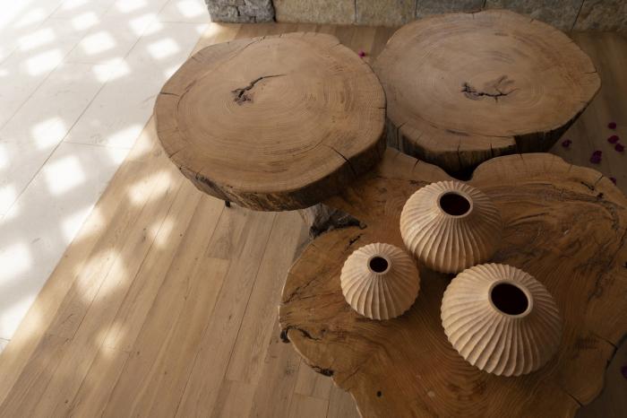 建筑师以庄园的周边环境为灵感,在室内空间的设计上采用了石材和木材这两种材料,并选择了暖棕色、青铜色以及沙滩灰这一类的色彩基调。同时,建筑师还利用皮革家具和橡木材质,营造了空间的舒适优雅感。