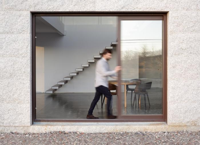 房子的几何形状跟随着所处的三角形地块,下方主体部分外表用石头作材料显得很沉重。上方较小的一个体块内部是跃层空间。这个建筑重新诠释了传统的由石头砌成的厚墙的本质。石墙坚实地将居住空间围护了起来。