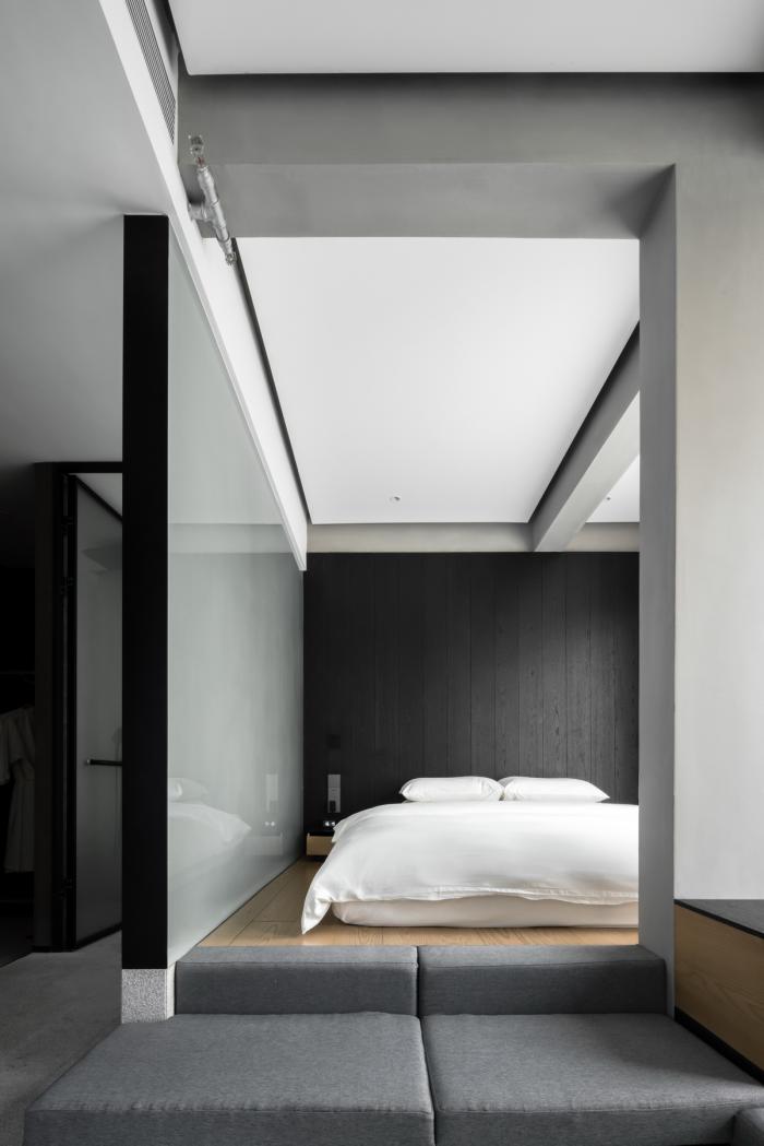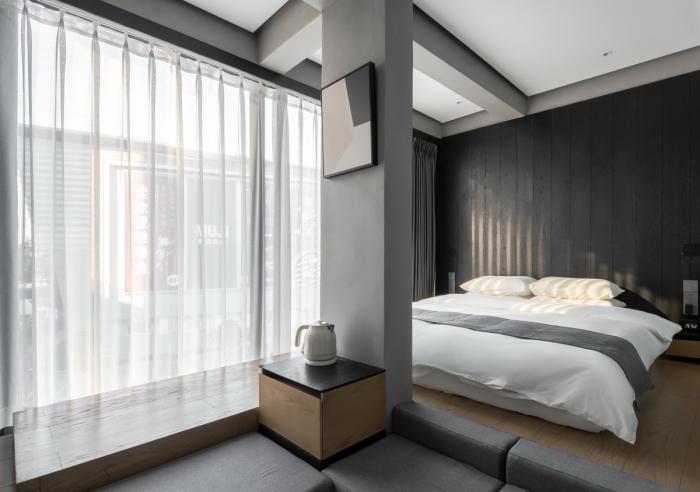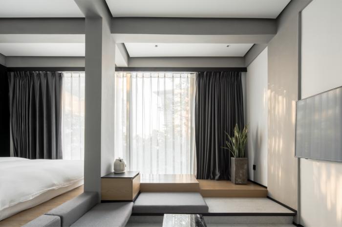 在有限的空间内,减少公共区域的流线,最大化客房内面积。强化原建筑的梁柱结构,并以此来叙述空间秩序与功能的划分。
