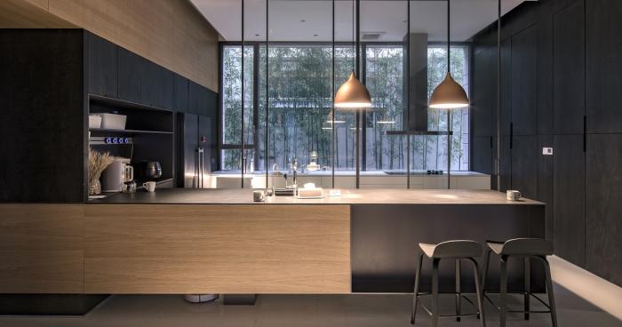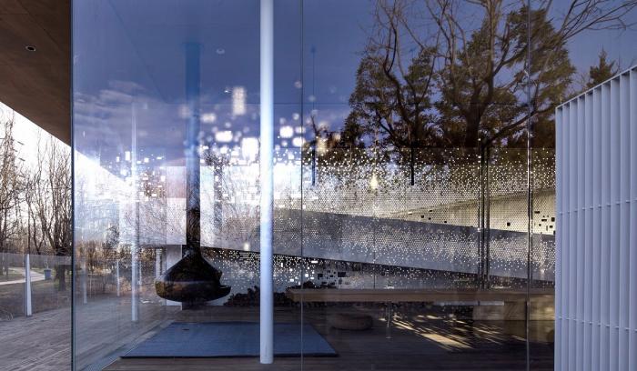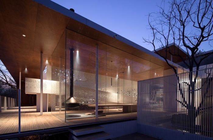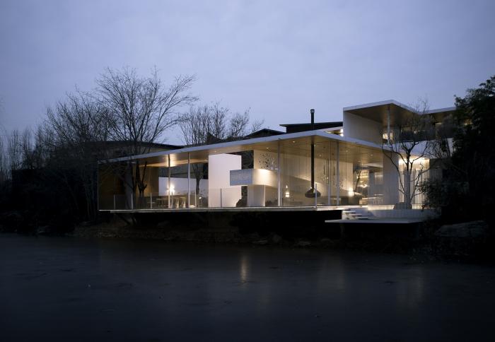 建筑的意图是希望将室内的生活引到室外,让业主可以更好地享受到这片美好的环境。因为背对着社区的特殊位置,建筑被设计成了一个半私密、半开放的空间。身处宅院之内,视觉上不容易察觉到密集社区的存在,眼里看到的是庭院的近景、湖面的中景和社区公园的远景。