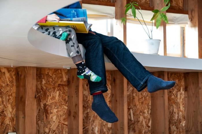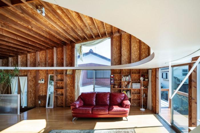 环形的天花将二层的空间分隔成了上下两个部分,它既作为结构元素,也作为室内装饰的一部分。因为该天花已经起到结构支撑的作用,所以我们可以在天花上部开窗,从而让室内能有更多的自然光照,也能更好地通风。