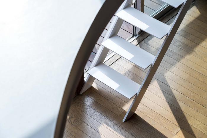 与住宅原有的木质结构相对,这个嵌入的环形天花成为了一个自主的存在。白色的实体与围合的椭圆形虚空,构成了实与虚的“相反相成”。