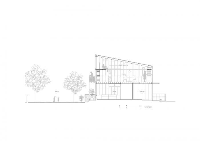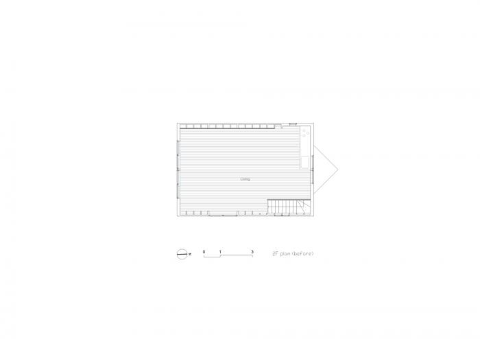 “椭圆天花”住宅(Ceiling and Ellipse)是针对一栋有20年历史的房屋的翻新工程。该住宅最大的特色是斜屋顶,以及朝南的大窗户。住宅的二层是开放的厨房和客厅空间,我们的改造方案是在该层1.8米高的位置嵌入一个椭圆形环状的天花,这个天花既可以上人,也可以作为储物空间。