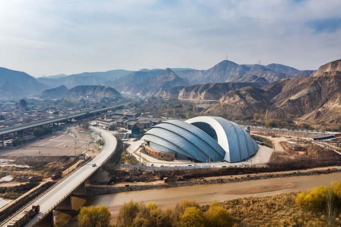 建筑体量巨大、新颖,建筑由两片巨型屋顶拼接而成,分别覆盖舞台与看台两大部分,并在屋顶上形成“天眼”,形成框景,便于观众观看激光秀与远处山脉,打造成为兰州区域地标建筑。建筑造型围绕舞台与看台展开,将建筑分为舞台与看台两个部分,分别以巨型拱形屋顶覆盖,屋顶表皮经过反复修改,采用外包金属板形式,由于项目邻近中国传统古镇,剧场外部造型吸收了当地传统建筑的元素,传统村落层层叠叠的屋顶排列(如固河口古镇)。外屋面板如巨鸟的羽翼一般,具有韵律地自上而下覆盖叠加。屋面饰板采用与瓦片有类似质感的材料。其他建筑部分的饰面材料采用砖石,木材,夯土等当地传统材料,使剧场能够充分融入到当地自然人文环境中。