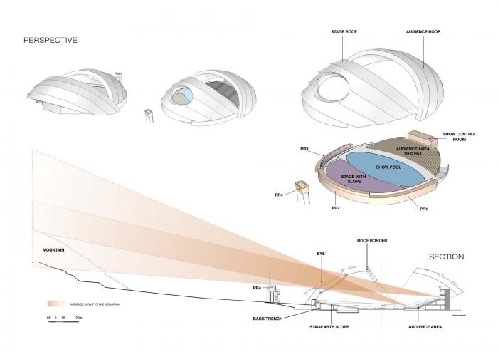 项目利用自然文化景观,打造以日月馆为主题的剧场,将自然景观融入到建筑中,观山观水观秀,将水舞与激光引入剧场,打造大型新形式剧场模式。