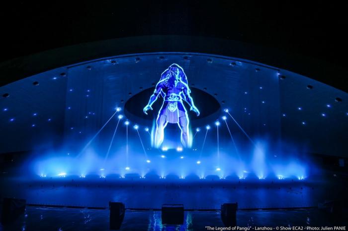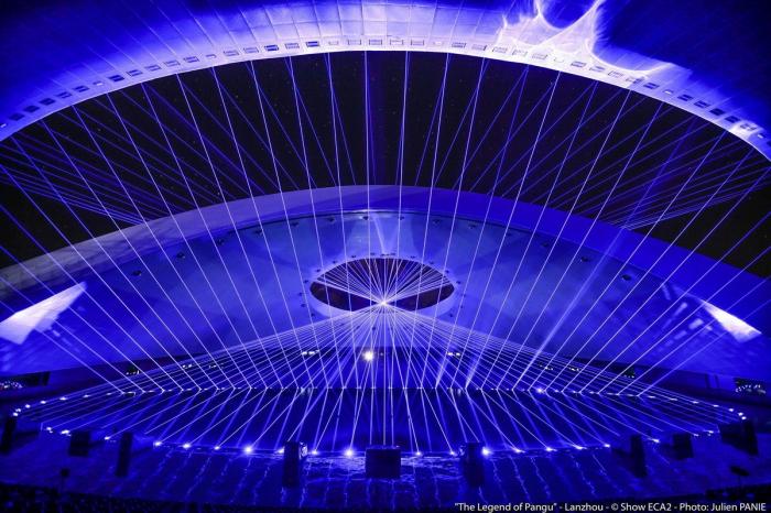 演出技术方面,在演出中融入激光、火焰、烟花等形式,利用深埋水中、悬挂于屋顶的舞台设备,形成丰富的舞台效果,设备技术先进,可长时间浸泡于水中;位于舞台、看台周边以及场馆外部的众多机房共同为演出提供技术支持。水池和舞台上方的开洞保证水效光效烟花等的正常运转,同时通过洞口,观众有可能窥见群山,建立了与场地的联系,增强了趣味,这是设计的初衷。