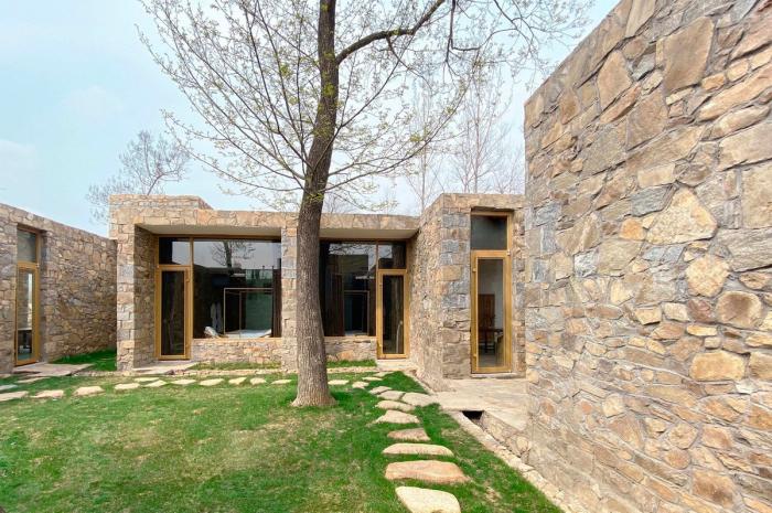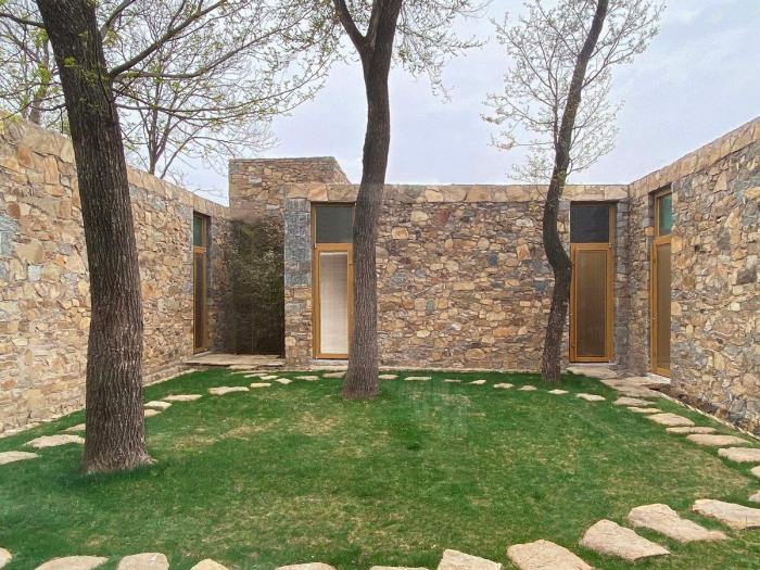 整座建筑磐居在山丘脚下,四面围合而成的建筑体量包含了餐厅、茶室、客房及接待室。每个房间的窗与中心庭院反向而开,这样的布置保证了流线朝内而视线朝外。基于私密问题的考虑,我们在窗外同样利用石头堆砌的矮墙来界定外空间与建筑边界,矮墙与朝外向的大面积开窗之间又形成了独立于整体建筑的微院落,既保证了室内空间的采光与视野,同时也满足了在整体空间中私密空间与公共空间的转换。