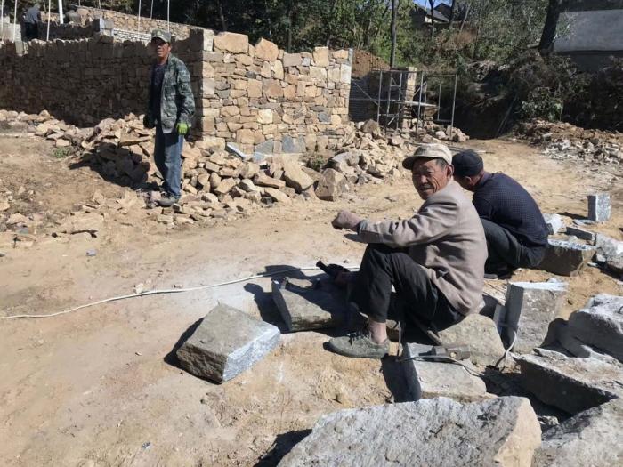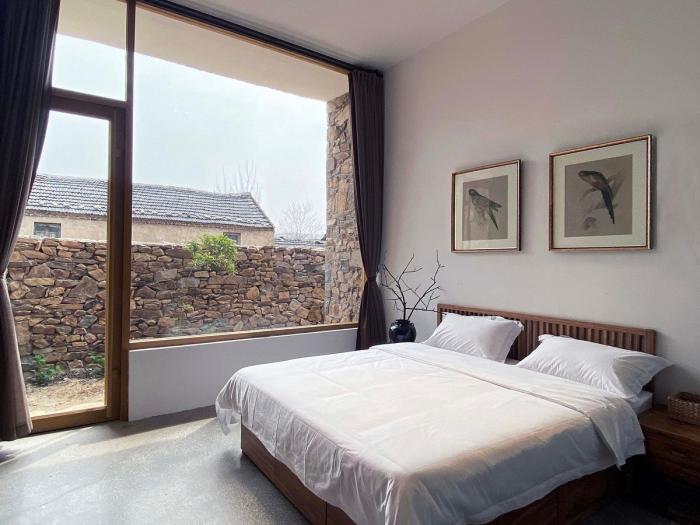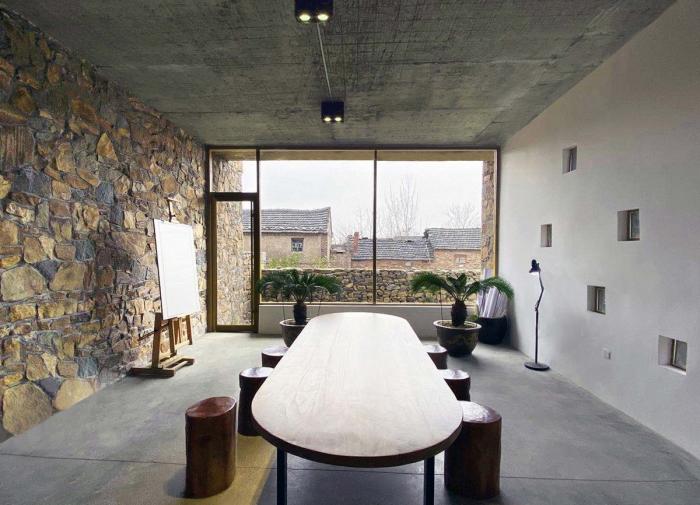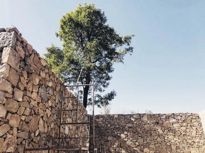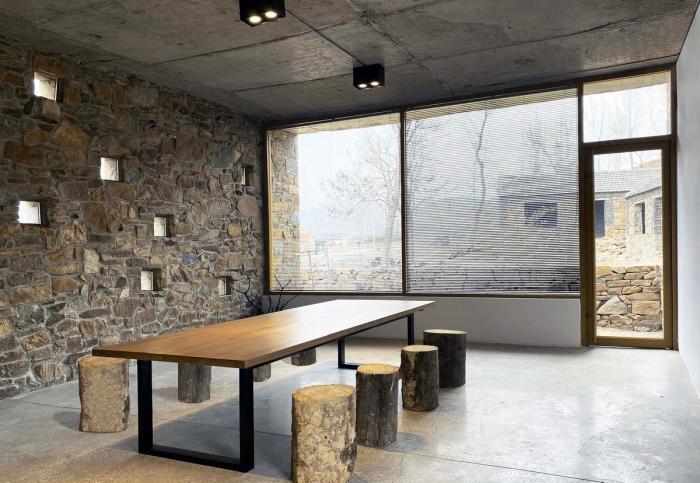 为了很好契合当地古村落的氛围,符合此地的气场,我们邀请了当地的工匠师傅,他们精湛的手艺是实现本项目的关键。整栋建筑墙体全部采用石头砌筑,石头斑驳的纹理给这座建筑赋予了自然的气息,使其更好的与山水环境融为一体。