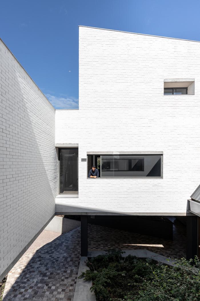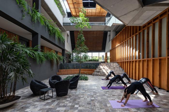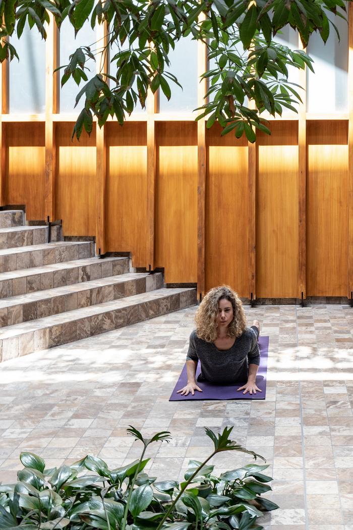 楼梯以及立面的横向“饰带”点出入口。穿过这一单层狭小的空间,进入的是一处宽敞的中厅。中厅是整个建筑的连接枢纽,聚集着道路、创造出使用者们之间的邂逅。此外,建筑也做到了建立私密与公共空间之间的连接。这是为了室外与室内空间之间,能建立起物理、视觉、声音以及感官上的联系。建筑与社会意识到了建筑对人们的影响,因此我们设计了这样一个有着能服务于社区,作为展览、健康、文化与艺术中心的多种功能的空间的建筑。