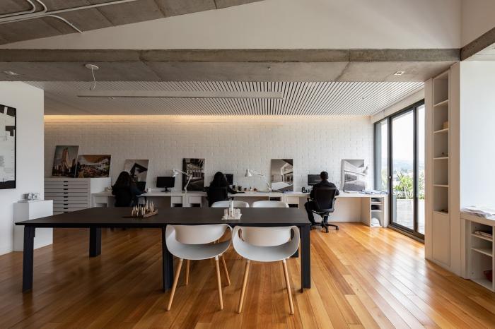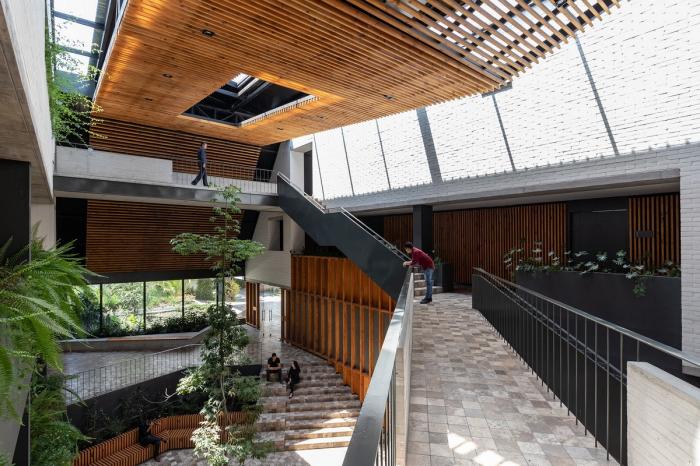 无法保留的树木被暂时移至温室,直到项目重新为它们决定新位置。建筑体留有一大体量室内空间(中厅),成为了办公项目的中心。场地在纵向上呈负斜率。建筑的截面遵循了自然地形高度,以此保护植被不受损害,同时创造了一系列不同高度的空间,营造了独特的路线与流通体验。