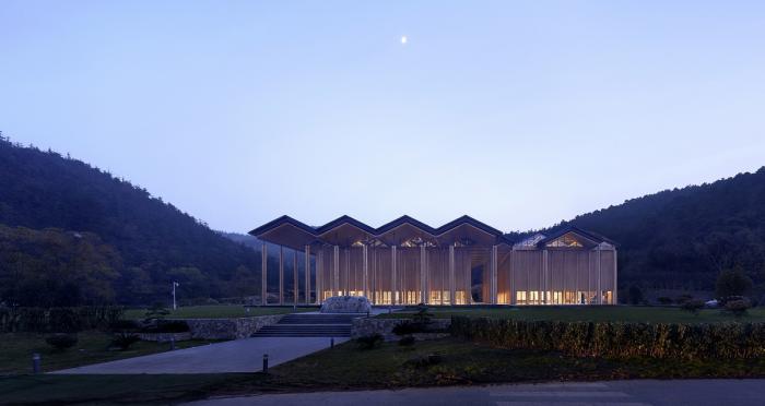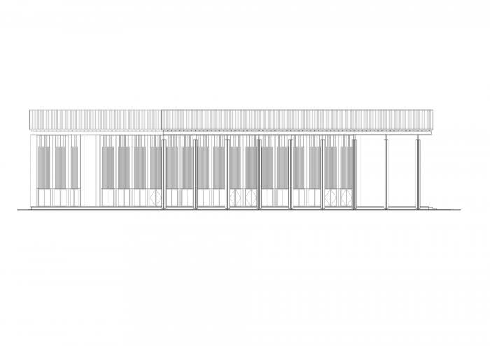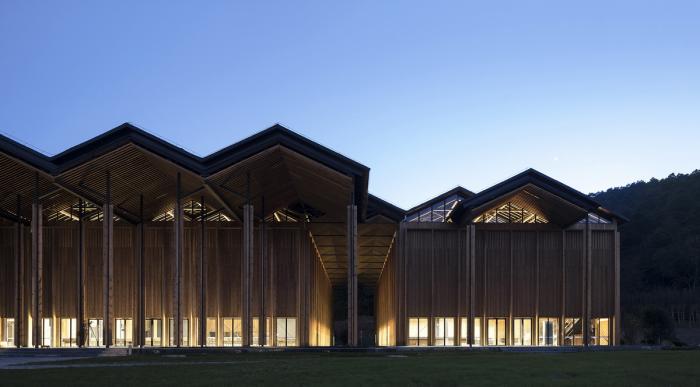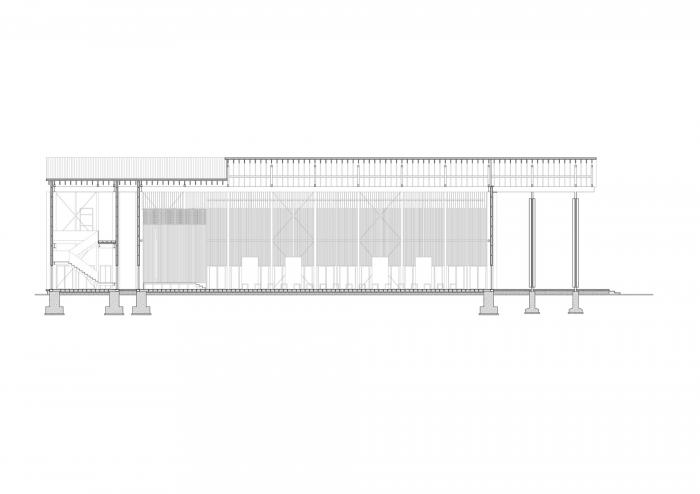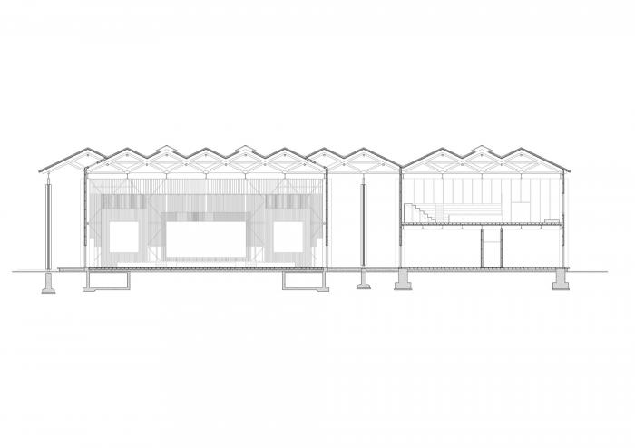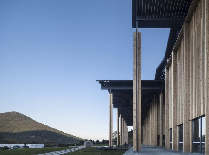 公社礼堂记忆的唤醒,自然产生了两坡屋顶的基本空间要素,事实上这个会议中心的大空间在多数时间也将作为村民聚会风俗延续的场所。而装配式的杆件结构则是对温室大棚轻钢结构建造类型的发展,虽然其复杂性和可靠性要远高于后者的要求,但是其对自然环境最少扰动的理性建造逻辑得以保留。