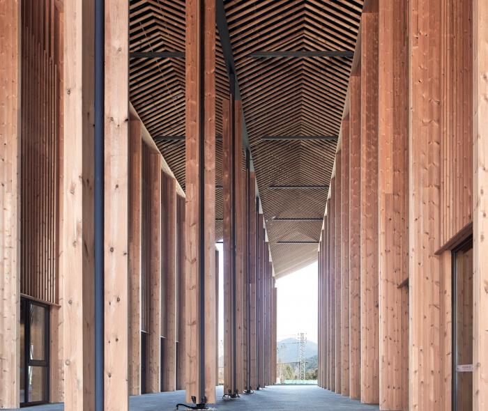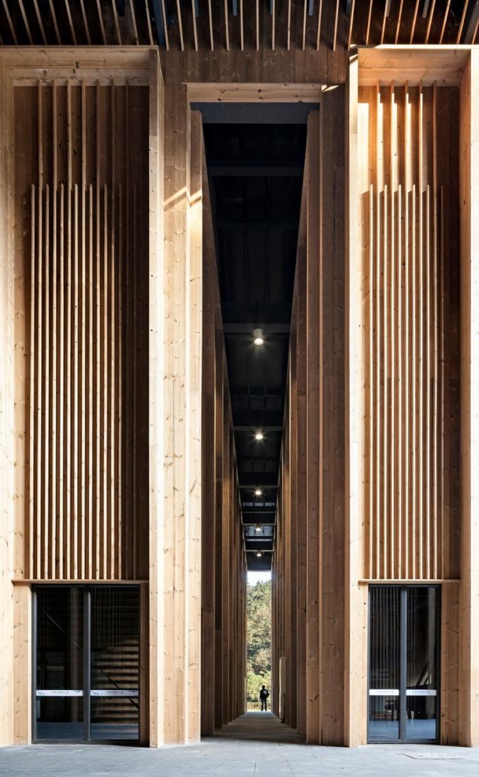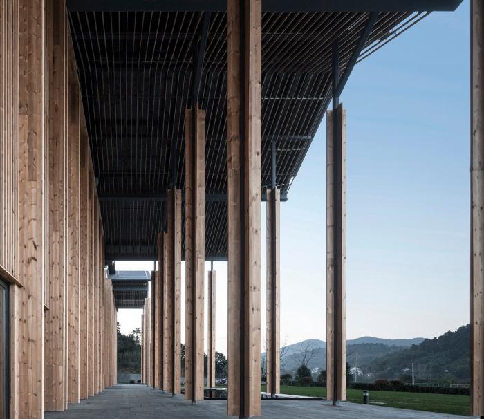 研究空间结构及张拉整体的结构工程师袁鑫,巧妙地将“张拉整体”(Tensegrity)的力学原理应用于柱的受压,将传统柱横截面单一的受力分解为受拉与受压,两个方向力的平衡为抵抗柱的变形提供了额外的帮助,超越欧拉临界力的限制形成截面尺寸极小的重载超压细柱。理想的会议中心支撑结构,应该有如基地周围竹海的翠竹,细密挺拔。预应力细柱技术支撑下,达成了截面边长14厘米,10.45米高,长细比1:75的细柱。45天快速建造的同时获得了良好的建筑品质,依据了工业化建造体系以及相应的设计和设计管理方法。