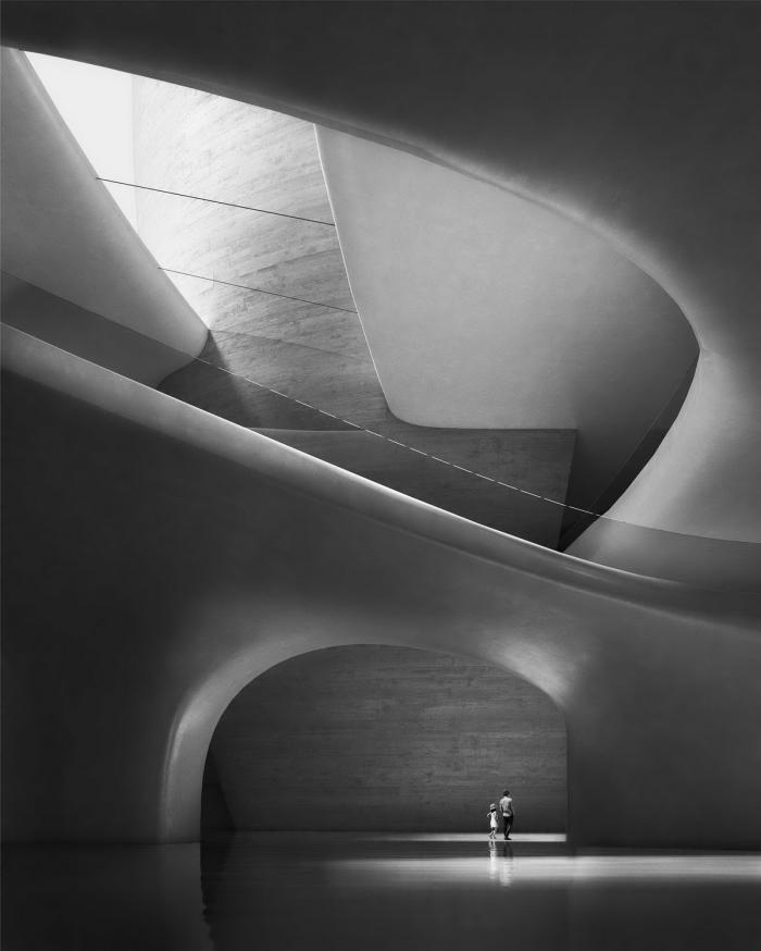 根据所在区域不同,功能多样化的公共展厅可以分为绿坡区域展厅、石群展厅和地下展厅。绿坡下是2倍层高的联通展厅;部分首层和地下一层展厅拥有6米净高的标准展厅;石群内则是特殊展厅。挑高具有标识性的大堂空间,作为重要的交通节点,明确空间方向性。建筑师大量使用自然光打破室内外的界限,让思维不受空间拘束。