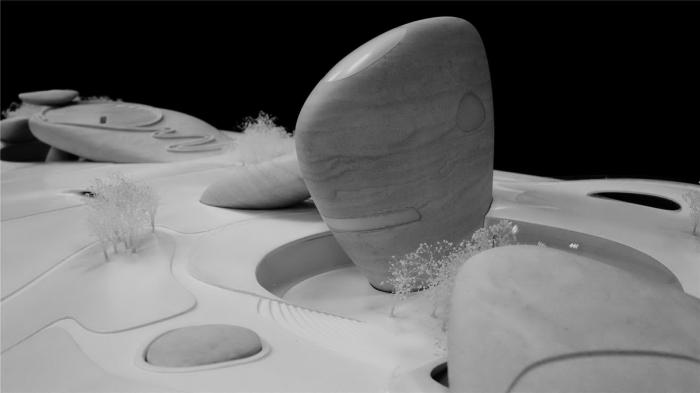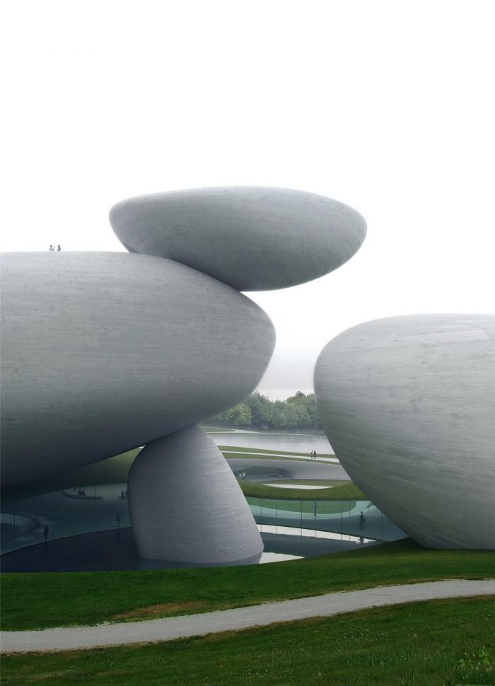石群内的特殊展厅是全馆的点睛之笔。自然绿色覆盖的屋面上,石头落水而出。自然石形态的多样性为室内建筑空间提供了灵活且震撼的展览空间效果。层高有30米,横向的可一次容纳3000平米的展览面积。自然光在半隐半实的石头中透入室内。在横向的石头表面,有拾阶而上的台阶,直登石顶。一个望天的精神空间链接着攀岩而上的曲径。