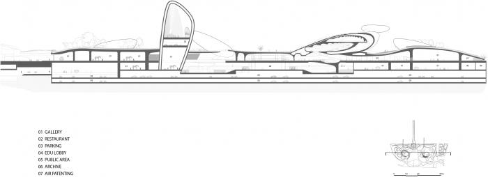 教育区横跨两层,连接一楼入口广场和海湾通道。两个地下展馆公共空间从北向南相连,建筑师充分利用绿坡下的大尺度空间,结合商业及餐饮服务设置激活展馆。
