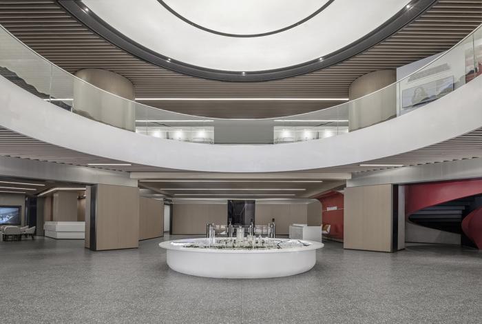 主楼首层主入口外移,扩大大厅室内空间,拆除局部楼板,创造通高大堂。同时,我们设置了连接首层和二层的共享空间的弧形楼梯。这些设计策略大大提升了建筑的空间品质。