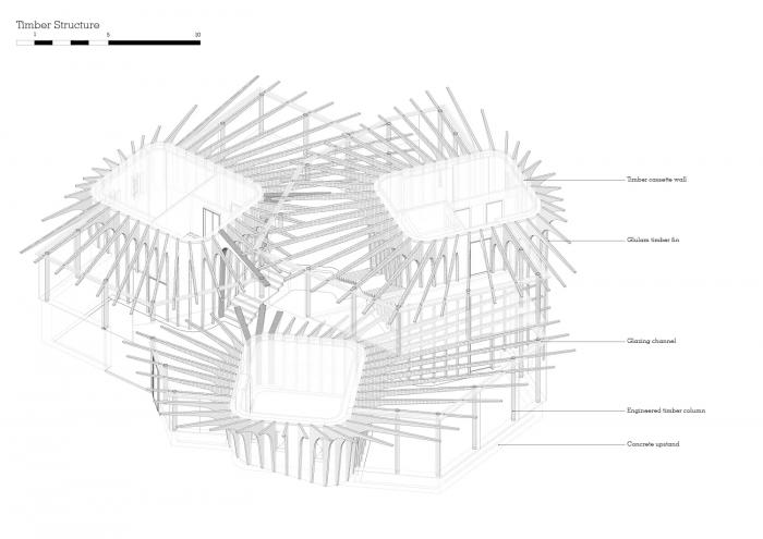 赫斯维克工作室为Maggie’s——一家为癌症患者提供免费的实际与情感支持的慈善机构,设计完成了一座新的中心。这座面积为462平方米(4,973平方英尺)的建筑位于圣·詹姆斯大学医学院内。它是该慈善机构的第26个中心,也是托马斯·赫斯维克工作室首个建成的医疗项目。利兹市玛姬癌症关顾中心(maggie’s leeds)位于一块倾斜的场地上,它由三个大型植物种植园组成,每一个种植园都围合成一个咨询室。它们围绕着该医疗中心的“核心”——厨房以及更具社交性的小组活动空间如图书馆、健身房等进行布置。