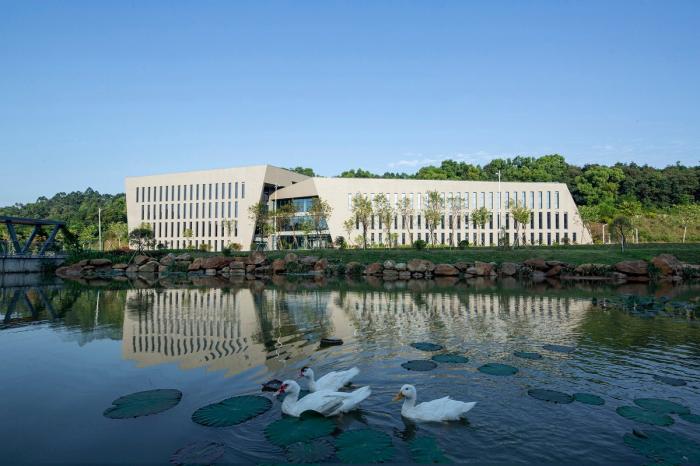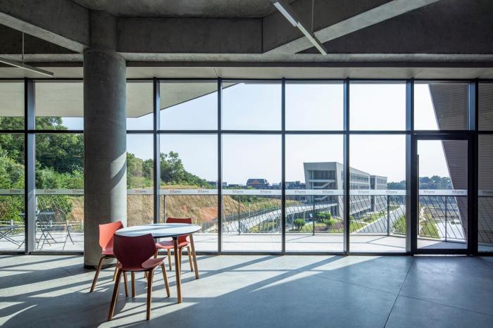 周边自然环境的特质决定了设计策略。设计将建筑切分成若干个方正的功能体量,沿用地摆开,“镶嵌”在绿色的山体环境中;体量之间采用通透的连接处理,如同铰链般消解用地曲折带来的布局问题,并使建筑融入自然环境。