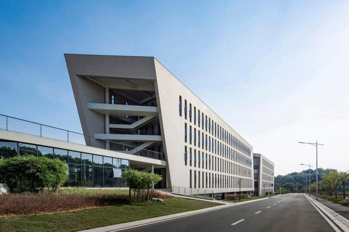 项目坐落在广州天河软件园一个尽端相对独立的丘陵用地,马蹄形山丘围绕着场地,背山面湖、环境优美;地形高差明显,建设用地窄长而不规则。根据城市设计要求,建筑高度需控制在20米内,以实现与周边山体的和谐。有趣的是,设计团队曾在多年前参与该区域城市设计并确定了这一限高,这在今天成为了富有挑战性的约束条件。