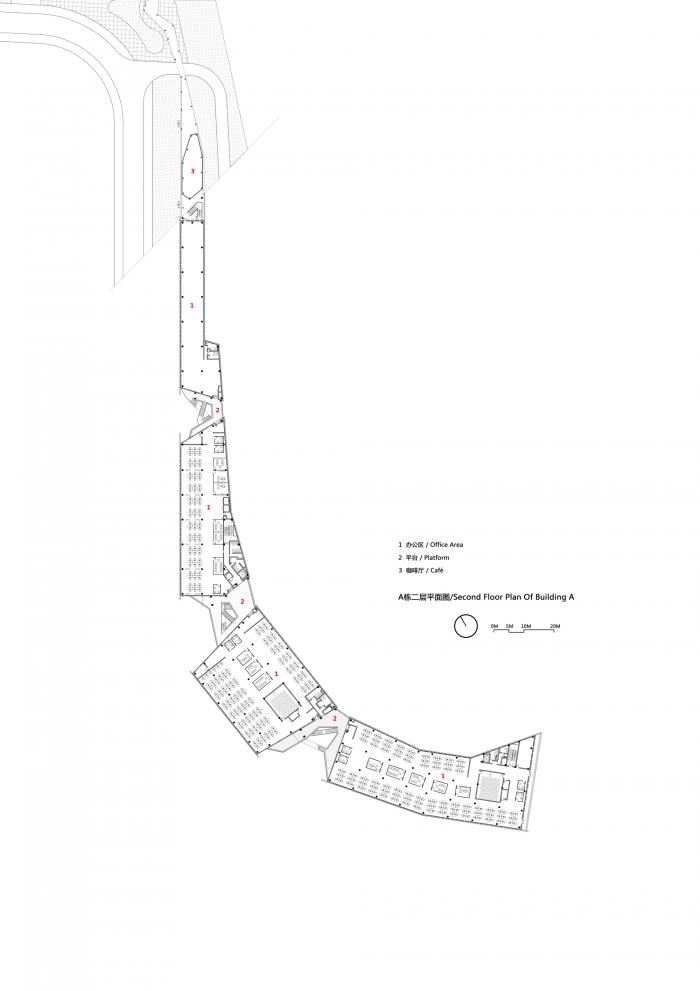 用地的东侧、北侧布置两栋主体办公楼,以首层的咖啡厅相连。西侧布置食堂、体育运动设施等服务功能,并在中心湖设置廊桥与办公楼连接。该策略在于鼓励IT从业者改变久坐办公的状态,在休憩、用餐或运动时,步行通过开放的平台、楼梯、廊桥,享受园区优质的环境。