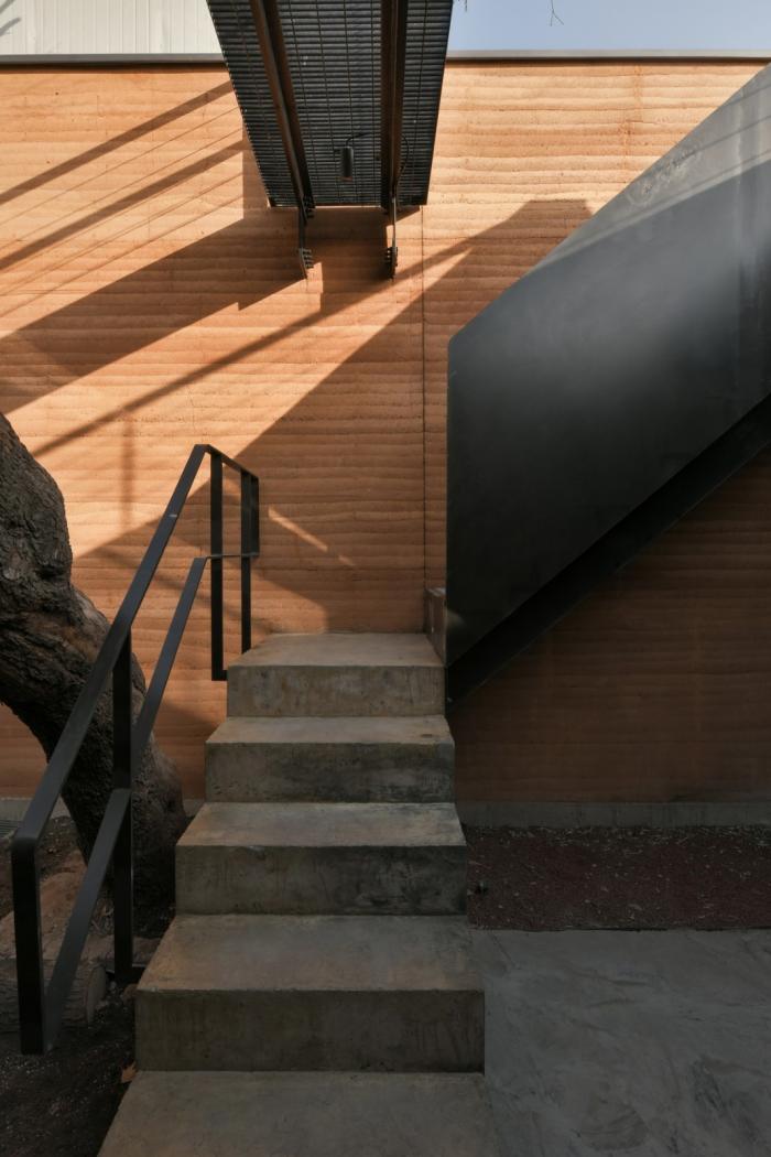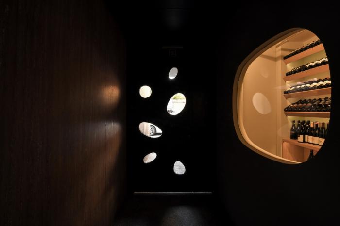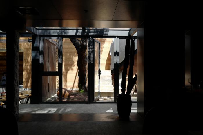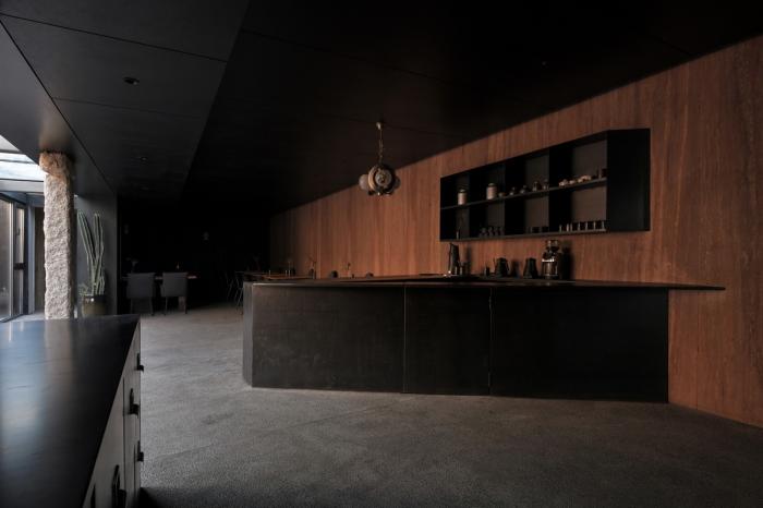 此外,建筑材料的加工和厨师对食材的烹饪方法不尽相同。在保留原始质感的基础上,通过克制的处理让细节变得更加动人,再以现代美学的方式呈现出来。东侧橘黄色的夯土墙和西侧深红色的洞石墙色彩温暖、肌理丰富,将使用了烧杉板、热轧钢板以及黑色水洗石等深色材料的餐厅包裹起来,跳跃与沉稳的色彩相互交织,产生了细腻的层次感,让空间气氛变得幽静深远。