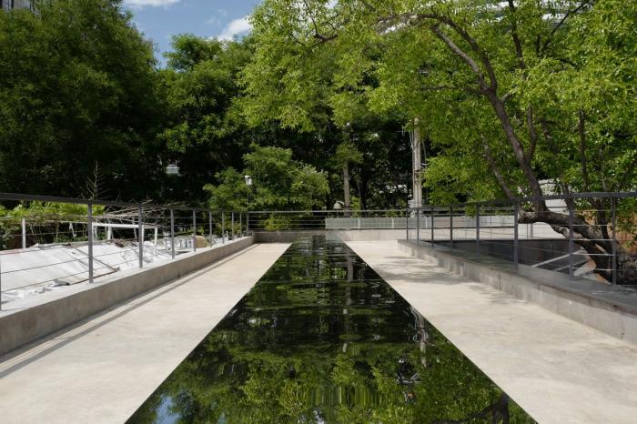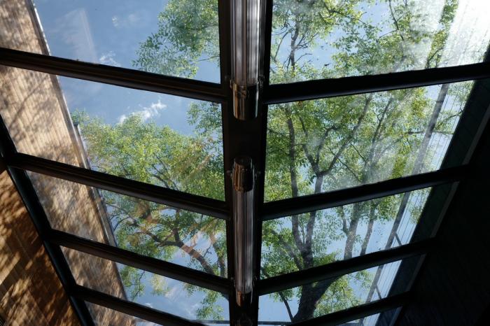 下沉就餐区上方是T型钢做骨架的“V”字形天窗,避开主要树干生长方向的同时,更把代表云南的强烈、真实且具有力量感的“原风景”引入到餐厅里。就餐者抬头仰望,可以感到近在咫尺的蓝天白云;从屋顶看过去,天窗倒映了天色和树影,像是漂浮的水池,傍晚灯光亮起,又会透出点亮城市的暖光。