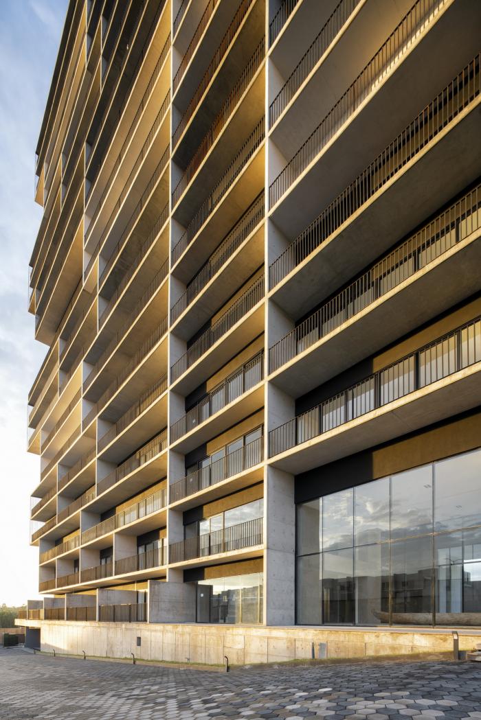 22层的公寓总共可以容纳226户住户,每一户的面积从84平方米到168平方米之间不等。大楼的接待厅是一个夹层空间,并为住户和来访者提供了一个与外部绿地互动的场所。而其余的空间,则用于住宅和配套居住设施所需。