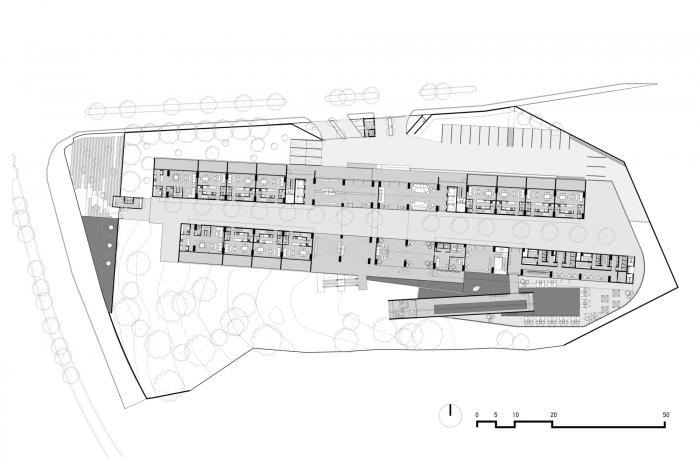 建筑师将部分的休闲娱乐空间置于一层,以和外部的绿地环境产生联系。建筑师将不同体块在多个维度组合成一体,使得来访者进入大楼所看到的第一个场景,是简洁并基础的几何元素。同时,建筑师还用一个白色混凝土体块容纳了水体,将户外水池所反射的自然光照引入室内,从而和室内环境产生微妙的关联。