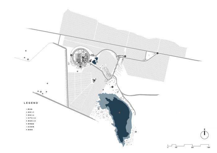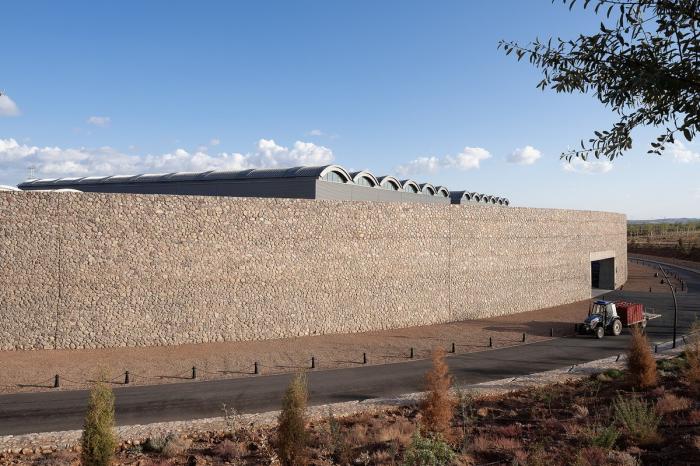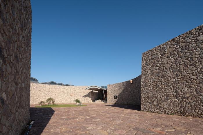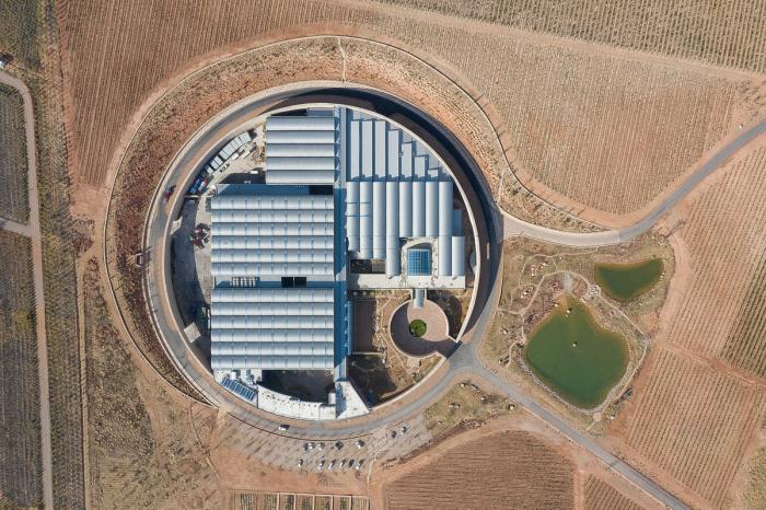 酒庄建筑由一道圆形石头墙围合而成。大圆内另砌一个小圆,做为酒庄的主入口。其内部由办公区、品鉴区、生产区、橡木桶酒窖、有机餐厅、酒店客房等功能空间有机组合而成,总面积为2.5万平米。
