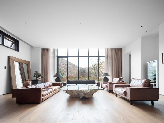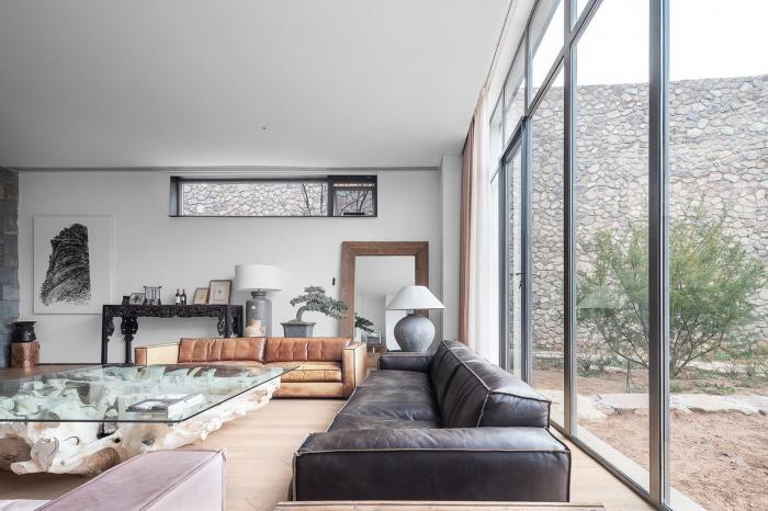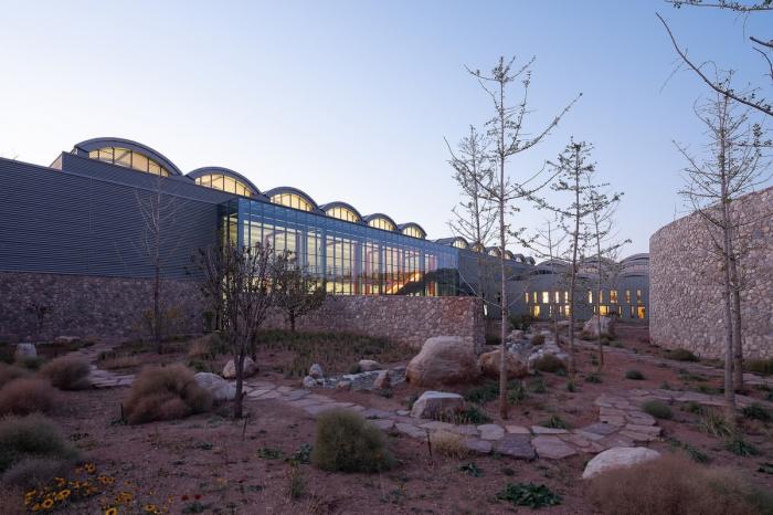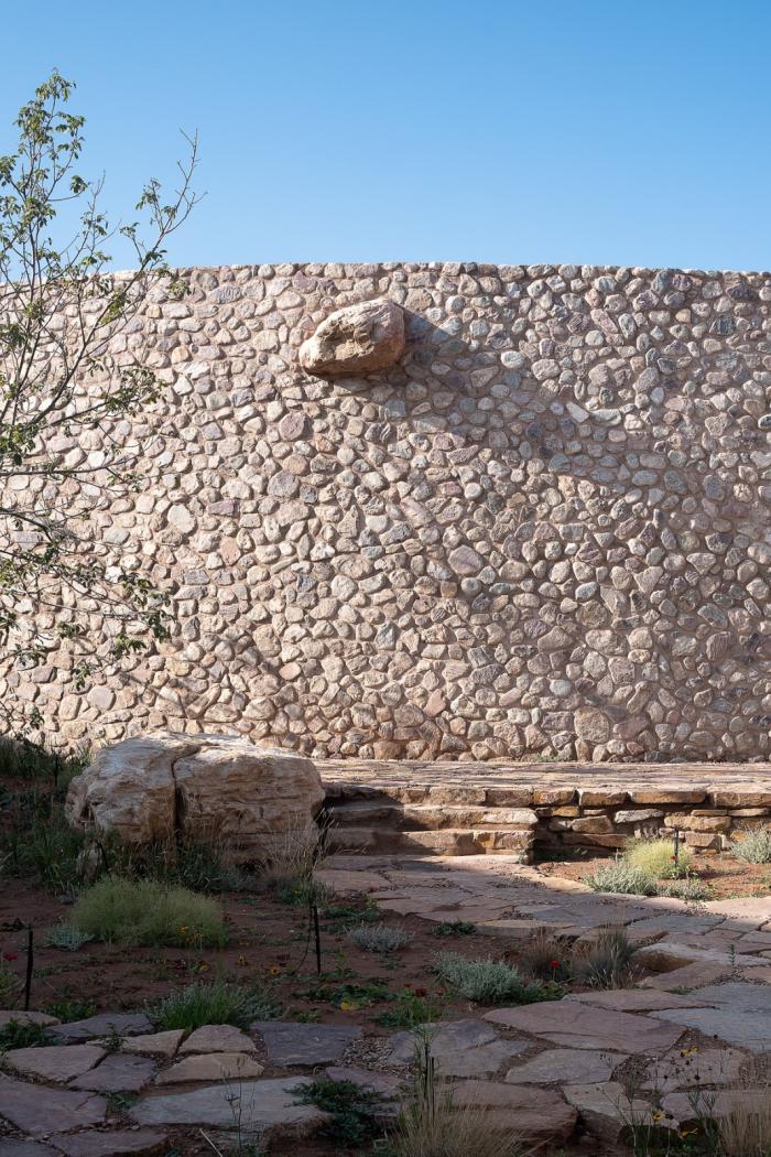 以当地植物为主的庭院,是另一种因地制宜。庭院内依旧是宁夏自然的地貌,红柳、骆驼刺、沙棘与巨大的贺兰山石错路成景,框进这个圆形外墙的弧线之内,被驯服的同时,依然保持着自然而然地力量。