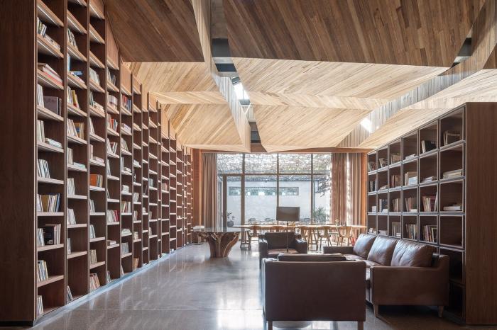 在室内的处理上,多以“可持续性”为导向。大量贺兰山石以原本的姿态进入空间,形成内部景观;经贺兰山石加工打磨成的水磨石,在空间中随处可见,散发温润而细腻的气质;而可回收虫蚀柚木,除了制成一扇扇等待被光影重构的门以外,还构建着阅读区的顶面结构,回应着延绵起伏的贺兰山的形态;植物染的软装布艺、干枯的葡萄藤制成的推门把手、一件件朴实的老物件……这所有的一切,构成了西鸽内部空间的日常情绪。