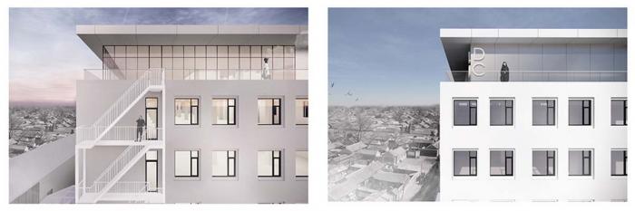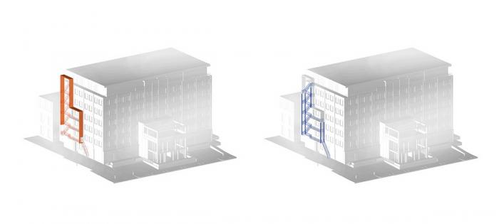 △消防梯围合 / 立面保留结构 / 门廊装饰柱 / 窗户边条