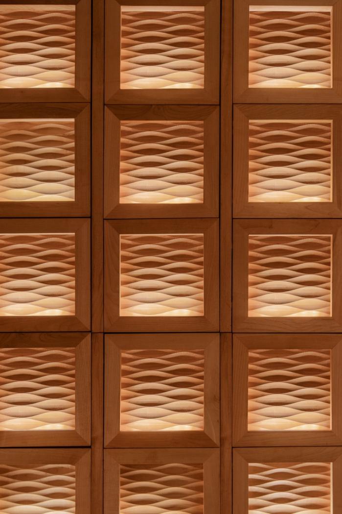 料亭的玄关位于天花板较低的二楼,因此玄关入口墙面的处理很重要为吸引客人的视线。我们将日本传统的麻叶图案解构为菱形和等边三角形,重组得到我们的双层格栅墙。我们从不同的角度能够得到不同的视觉效果,但从正面看的话麻叶图案依然是视觉中心。在鞋柜面板上我们加工了日本传统雕刻技术「名栗」。