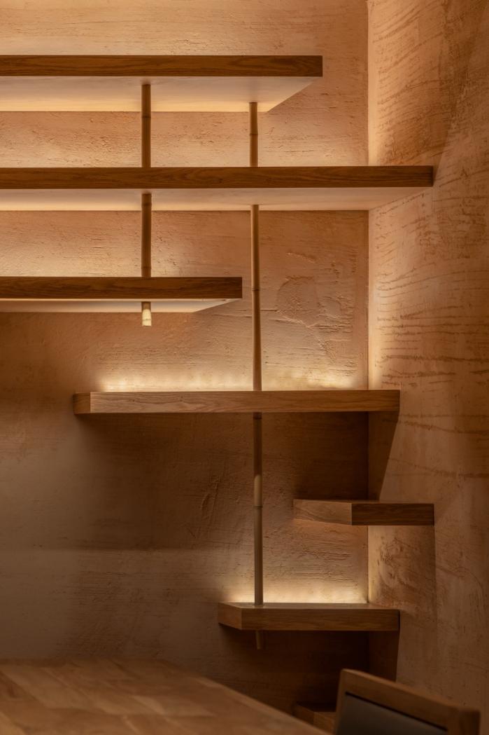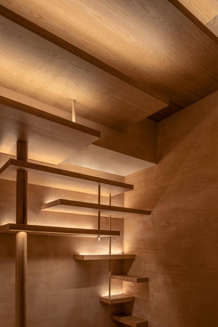 三层是料亭空间的VIP房间,整个空间非常安静、私密。为了利用三层天花比较高的特点,我们在每一个VIP房间的地板和天花之间都设计了贯通上下的装饰柜,并且安装了间接照明。这是参考了京都「修学院离宫霞棚」而得到的想法。