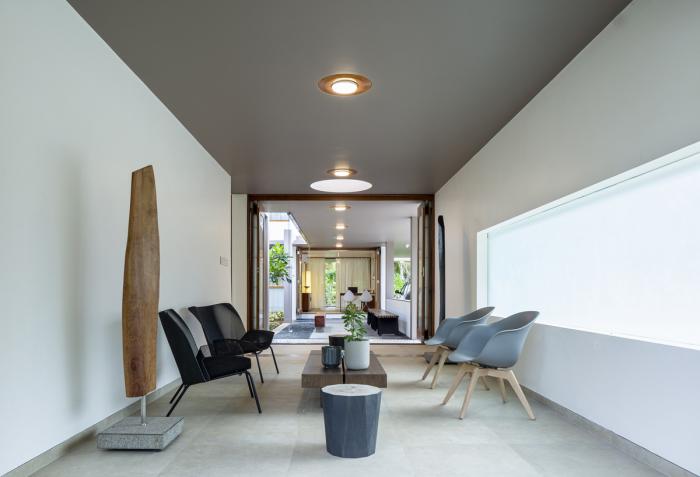 建筑平面被策略性地规划,在为家庭成员提供私密性的同时,借助其朝向优势,引导主导风向的季节性转变,使其穿过建筑空间,促进了贯通的对流通风。这使房间尽可能空气清新,室内温度尽可能低。波浪型的体量和一些悬挑的板片在变换的热带阳光下彼此遮挡。这些漂浮的屋顶也帮助有效地收集雨水,雨水流过一系列在项目中随处可见的定制的不锈钢雨水管,进入设计的雨水收集腔。这些大屋顶上放置的一系列太阳能板帮助产生房屋自给自足所需的能量,使其保持与世隔绝的状态。