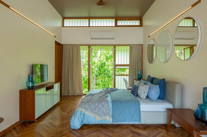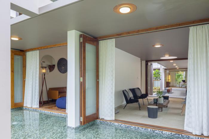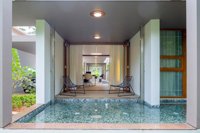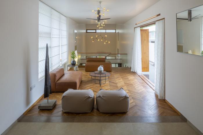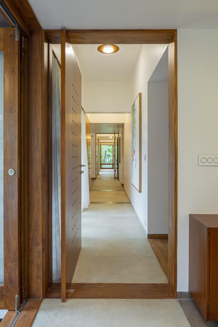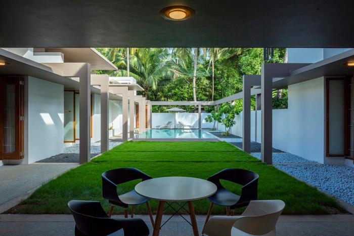 两个大庭院被设置在平行的体量之间,用以改善项目的通风和流线。北向的入口庭院是户外就坐空间的延伸,而南向的更大的庭院是地面层家庭空间和餐厅的延伸,其中的一个天井餐厅和一个游泳池成为必要的溢出空间。这些庭院之外密集的植被与房屋网格中稀疏而有规律的景观形成对比,创造了一个妙趣横生的混合物。