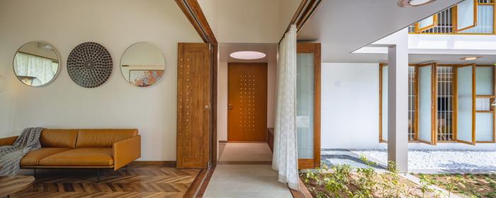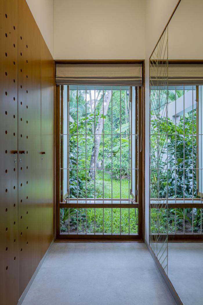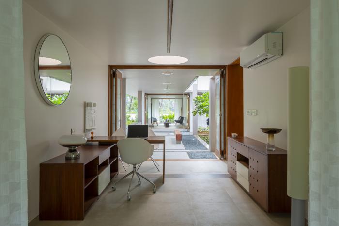 “格框里的度假屋”坐落于一个叶片状的街区,处在一个稍稍抬高的地块,通过一条安静的道路与外部连通。住宅为沙迦(Sharjah)的一对夫妇和他们的四个孩子设计,这栋房屋应该在他们频繁前往喀拉拉邦(Kerala)期间成为一个休闲放松、自我更新和享受天伦之乐的场所。这栋藤蔓般的房屋和它的许多房间能够容纳并娱乐这个家庭,和一些在这些时候可能会和他们同住的亲朋好友。最后,由于这栋房屋应该成为他们永久的家园,它也被如此设计,而非仅仅作为一个度假别墅。