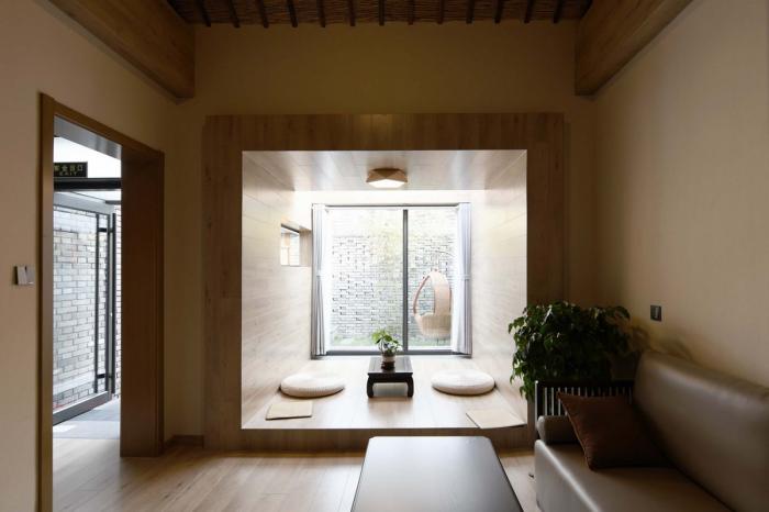 小院虽深,幸面南,光直入,为木台,可憩可卧,实则慵懒之处。院中有修竹青石,以慰老苏“不可居无竹”之求。东院内有一树,亭亭如盖,未敢伤之一叶。老屋仅一层,举架奇高,于木梁后置草席,以御寒,然则依旧高,故分两层,屡置楼梯而觉不爽,遂做博古架,从中而行,虽累却有趣。上层做榻,下层做床,外为高厅,内为寝帐。三舍皆非奢华而重乡情,置身期间,愈深愈静,眠足可安。