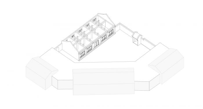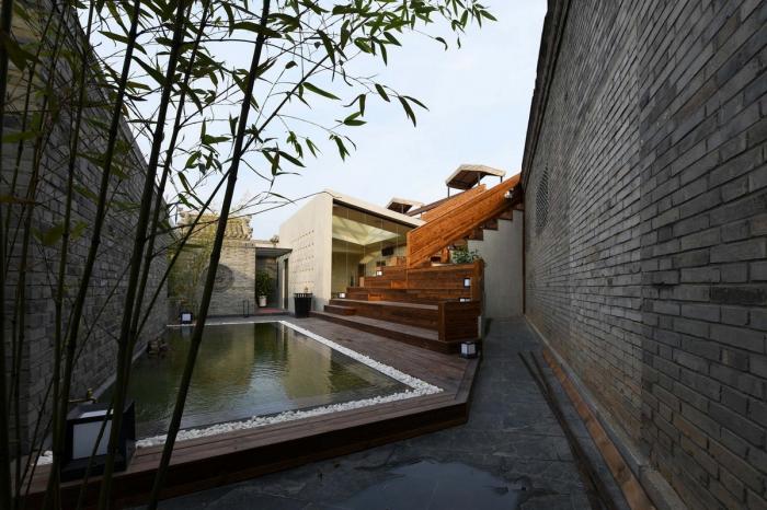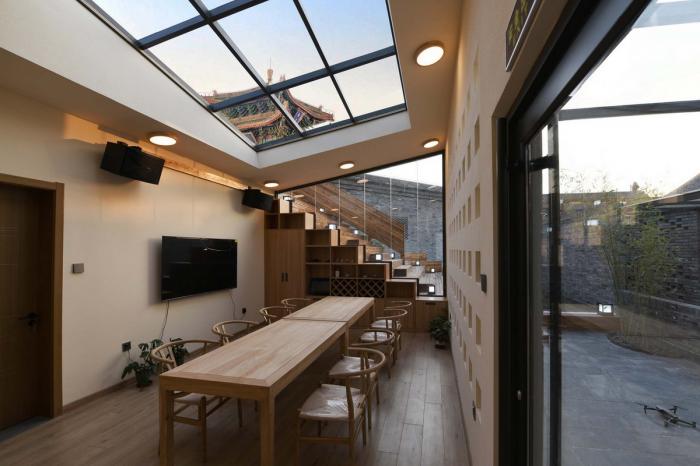 置身苑中,为玉皇阁之凌势所撼,颇有觉悟;漫步老街,见乡风淳朴,甚为感动。农夫妇孺,嬉戏往来,烧饼豆腐,香飘深巷,何以闹市中作雅居,喧嚣中设雅园,实为一题。于是将院中分,南北为动静两区,筑高墙为隔,划分三间小院,各置一轩,轩者,有窗之小屋,故顶开斜天窗,侧开大窗,以望阁,阁旺则院兴,故所有景面阁而向。