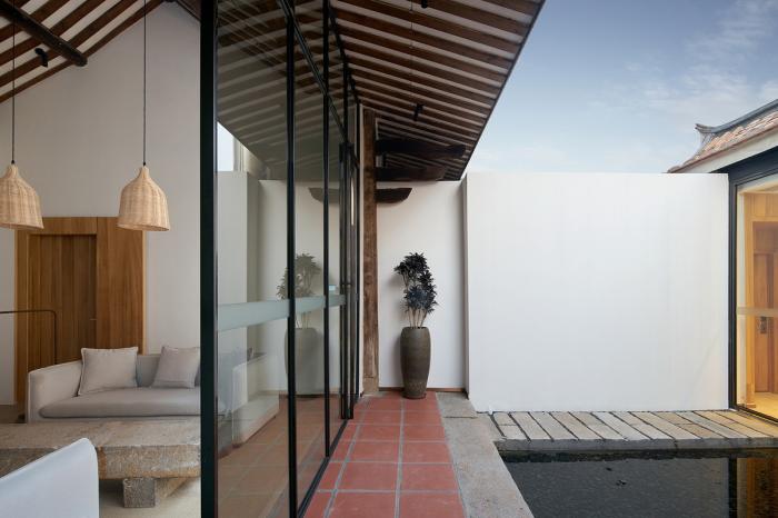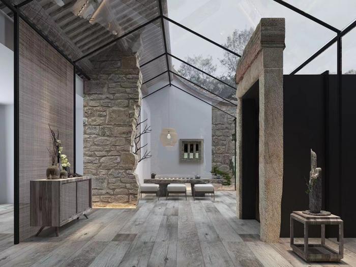 2号楼倒塌位置为一进门厅和厨房的前半部,原木屋架已快倒,还有一个未倒的大门,中间两处厢房也已倒塌,中间养了一头牛,考虑到建筑位置刚好处于村里的主动线交叉口,设计在一进门厅和右厢房直接套入一钢结构架来支撑原有屋面木构体系,把外部用大玻璃展现以增加通透感的同时,增加邻里关系。中庭天井两处厢房采用1号楼处理方式,简洁明了。