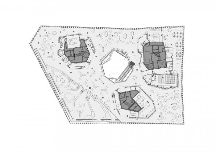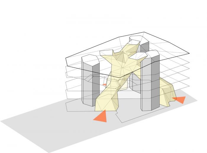 建筑师将地面层的立面,设计成全透明的形式,以保证图书馆空间的开放性及其与都市环境的关联度。建筑师设置了三个不同方向的入口,从而形成了三个相应的斜切光轴,并给来访者提供了不同的视觉体验。同时,这三个入口光轴还与天井所渗透的天光,有着一定的呼应关系。