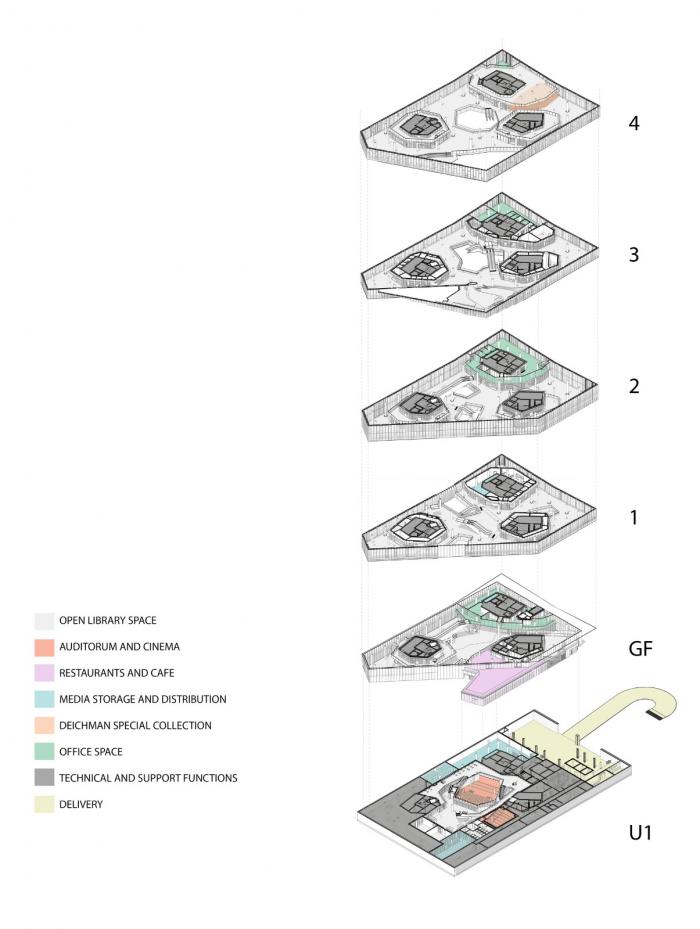Lund Hagem和Atelier Oslo建筑事务所曾于2009年共同赢得了奥斯陆新图书馆的国际设计竞赛。当时的竞赛希望为来访者提供一个具备全新设施的现代图书馆空间。而获胜建筑师的提案,则是通过开放整体的空间设计,为来访者提供一个个意想不到的空间角落,从而营造独特的环境体验。