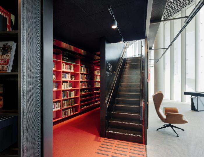 这些相应的封闭空间和壁龛,则可用于临时装置展陈和各类展览所需。建筑师在这片区域使用了明快亮丽的色彩,而在开放的公共空间,则选择了相对中性的色调。而入口光井旁所使用的的混凝土材质,则使得图书馆的空间变得更具辨识度。