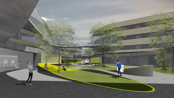 起伏的地景成为运动馆和文艺馆的屋顶,地景之上又充满丰富的活动场景,并且,普通教室区、宿舍区、实验教研,有日照、间距、声呗等使用要求的小空间,形成独立又能相互联系的流线型,掩映于地景之上的森林中。创造出如山丘森林般的充满活力的多维校园生活空间。