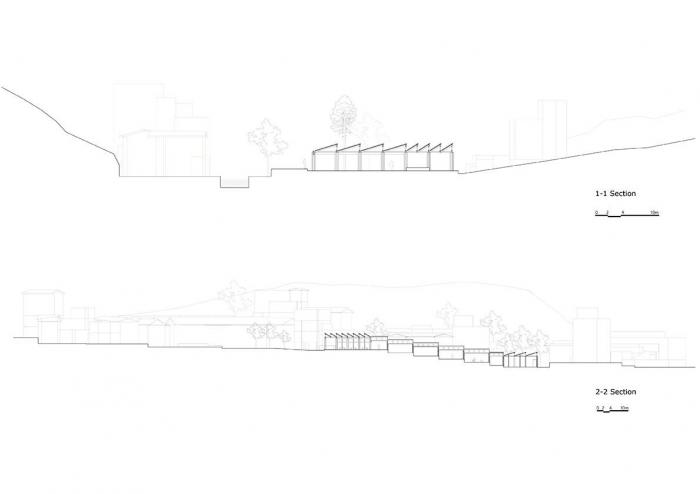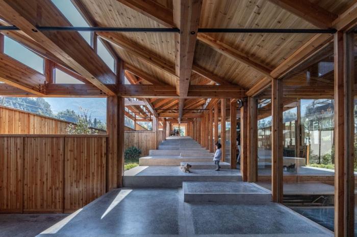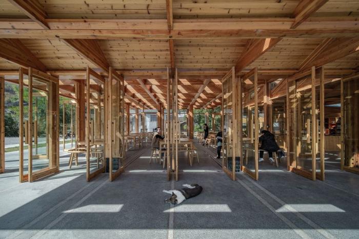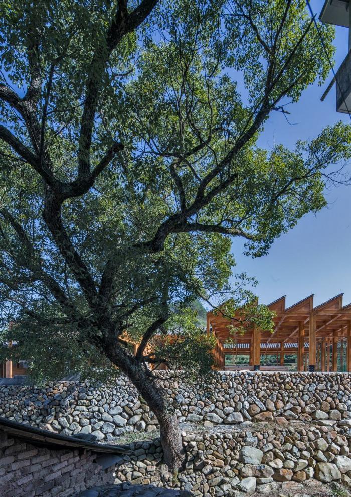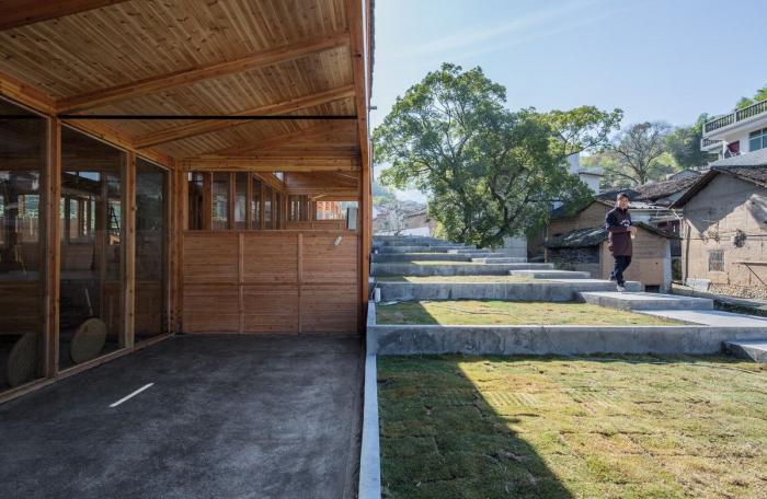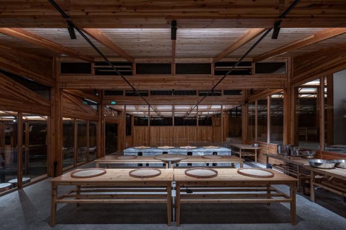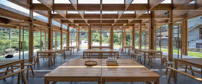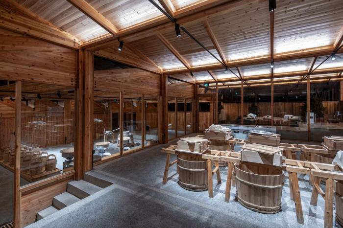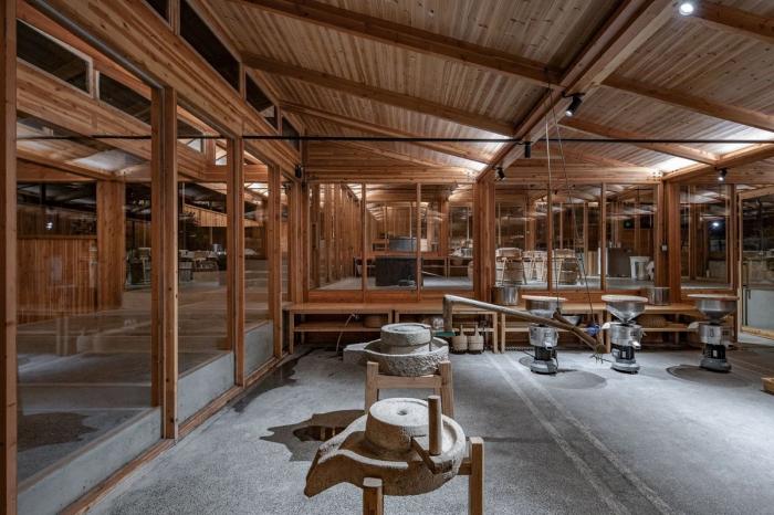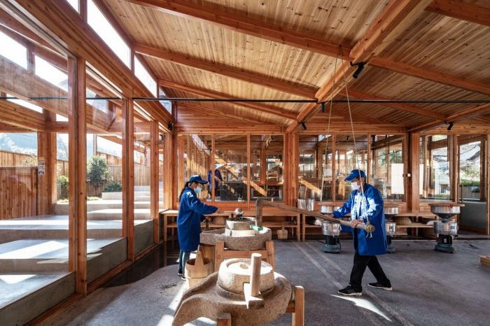 建筑的一侧设有供游客参观的通廊,游客可以顺着楼梯按顺序观看到豆腐制作的整个过程,最后到达最顶端的品尝区。这里不仅可以尝到新鲜出炉的豆腐,也能欣赏到溪水对岸历史村落的美丽景致。工坊整体采用木装配结构,在实现现代工坊生产目的的同时,也与村庄内传统的榫卯结构房屋相呼应。