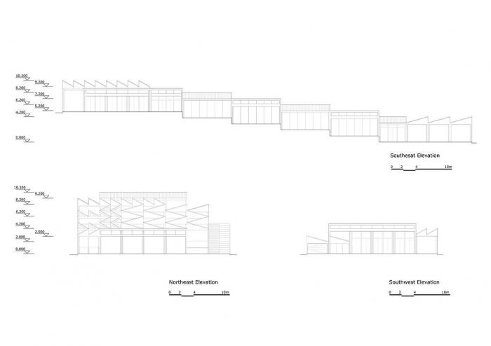 工坊的车间功能按照生产的工艺流程沿地形阶梯向上。在空间上由原料准备区,磨浆区,煮浆区,炸制区,摊晾区及品尝区等六个功能区组成。