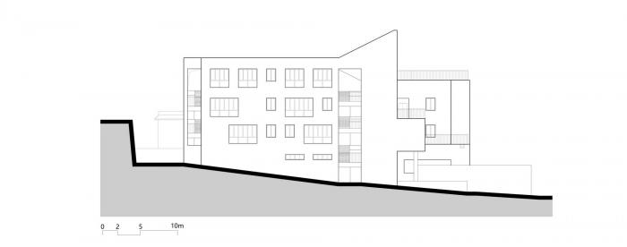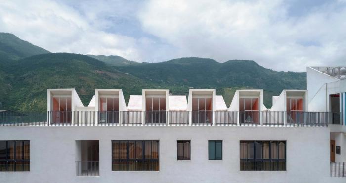 中庭各层走廊交错,形成空间上视线与行为的游戏。各层的建筑开口将来自山谷的地形风导入中庭,结合侧天窗,形成通风采光良好、舒适的小气候。