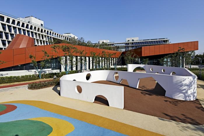 将不同的项目整合到一起:在首层沿街设置活跃的零售商铺和服务设施、中部楼层设有一个带有104间客房和办公空间的酒店、顶楼设有2500平方米的育儿园,最后在庭院处建造一个带有报告厅和游泳池的社区中心。这样的浦口文化中心并非只是一个政府服务中心,还是人们心驰神往的地方。