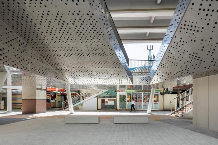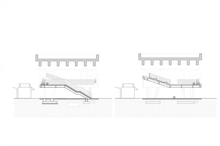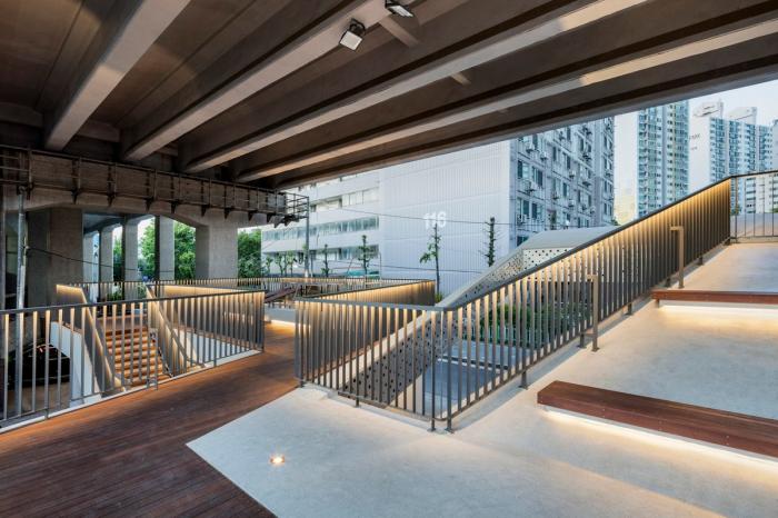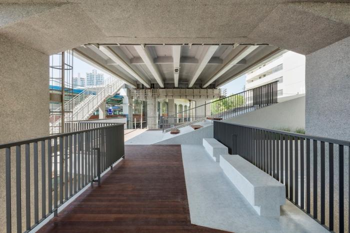 “露台广场”是一个中线空间,分为上下两层,运用天台打造了一个全新的公共空间。上层的空间呈东-西向分布,止于一条高架道路。下层空间则把周围街区融入了基地,又把基地扩至了周围。露台的上方用做一个供文化活动,基本锻炼和放松娱乐的空间;露台下方是本地居民白日避暑的地方,晚上又是附近餐厅和小贩的户外露台咖啡厅。本地居民的日常生活就在‘露台广场’这个庭院空间随着时间而变化着。