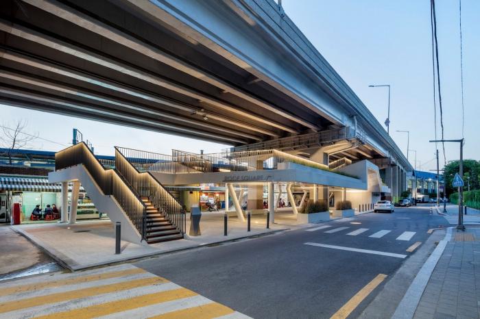 基地位于东大门附近高架桥的下方空间。上方是大型基础设施,铁路立交桥与公路立交桥在上面相叠着。这些高架桥隔绝了城市的尺度和周围的街区,它们之间的区域被孤立着,如同时间停止的静态空间一般。项目致力与成为本地社区的中心,当作不同人文与体育活动的社区空间,在城市里无人问津的地方利用建筑元素“露台”来连接周围被隔开的街区。